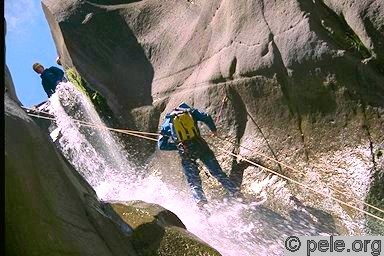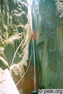 Canyoning cirque de Cilaos, La Réunion, Océan IndienLe canyoning est un sport très musclé, il consiste à descendre des cascades en rappel.C'est un sport à sensations, La Réunion est un très bon endroit pour en faire, les décors y sont majesteux. Les chutes d'eau sont très hautes et verticales. Par exemple, à Cilaos, il y a une succession de cascades dont la plus haute fait 55 mètres. Pour finir, il y en a une descente de 120 mètres avec changement de cordes mais sans eau. C'est très impressionant.